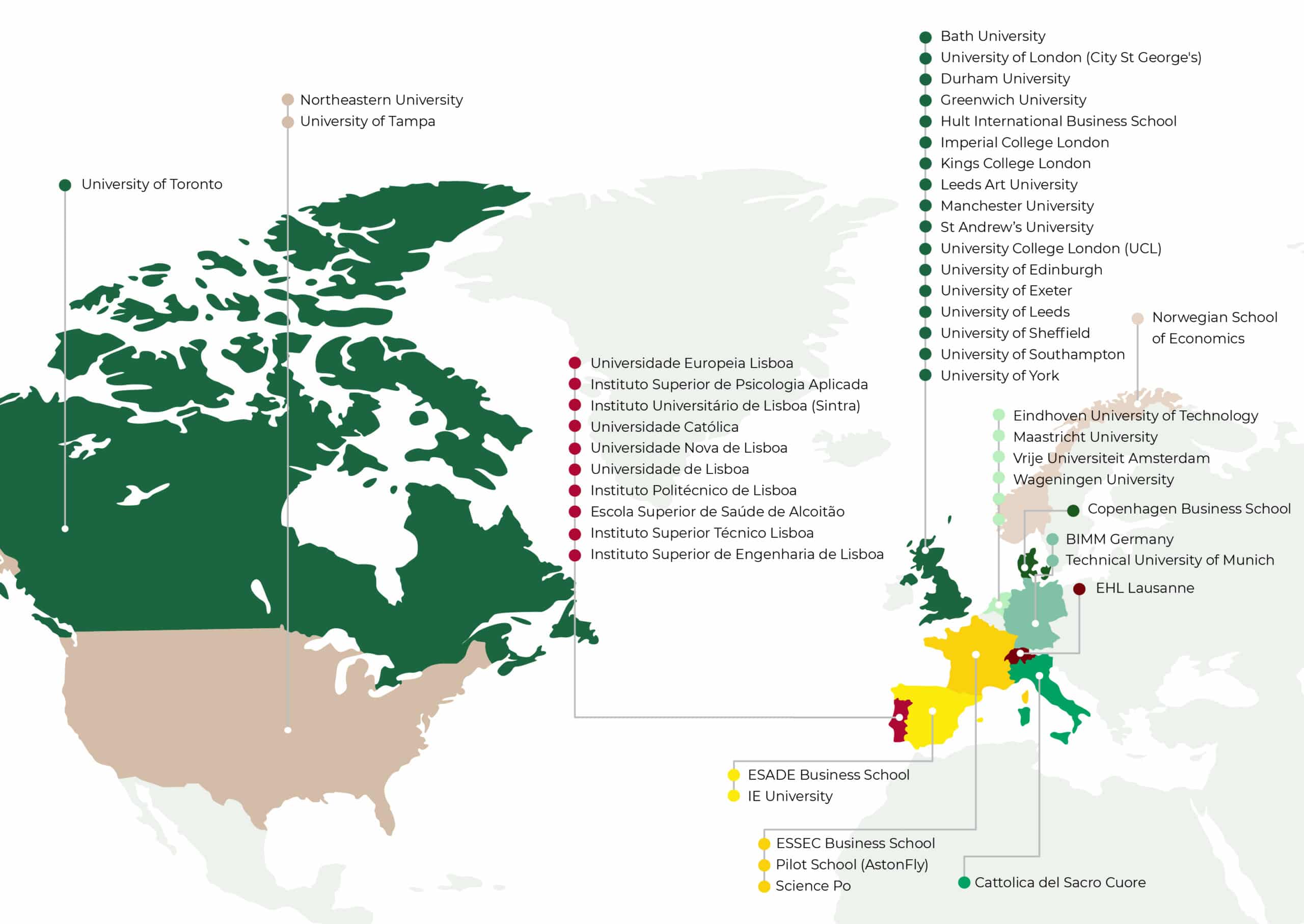 Over the years, students have accepted places from top universities in the UK including: Bath, City, Cambridge, Edinburgh, King’s College London, Loughborough, Manchester, Oxford, Royal Holloway, St. Andrews, UCL and Warwick. USA university offers include MIT, UCLA and NYU. Other international offers include Amsterdam, Bocconi, Delft, IE and Maastricht, to name a few. And closer to home, Católica and Nova SBE in Portugal.